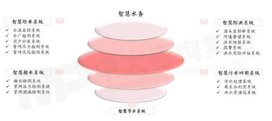 智慧水務(wù)系統(tǒng)由智慧給水、智慧排水、智慧防洪、智慧污水回用、智慧節(jié)水等五大子系統(tǒng)構(gòu)成,每個(gè)子系統(tǒng)下又包含水源監(jiān)控、水廠檢測、用戶超表等不同功能模塊。