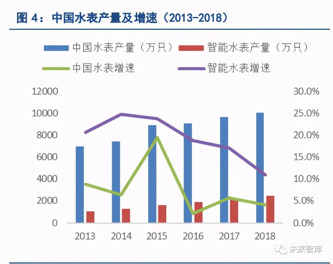 智慧水務是通過數(shù)采儀、無線網(wǎng)絡、水質水壓表等在線監(jiān)測設備實時感知城市供排水系統(tǒng)的運行狀態(tài),并采 用可視化的方式有機整合水務管理部門與供排水設施,形成“城市水務物聯(lián)網(wǎng)”,通過 AI 賦能,可將海量 水務信息進行及時分析與處理,以更加精細和動態(tài)的方式管理水務系統(tǒng)的整個生產(chǎn)、管理和服務流程,做出 相應的處理結果輔助決策建議,從而達到“智慧”的狀態(tài)。其中,“智能水表”在整個智慧水務系統(tǒng)中扮演 著的“眼睛”的角色,是實現(xiàn)智慧水務的基石。如鷹潭市,在全域應用安裝了 13 萬塊智能水表,實現(xiàn)了用 水實時計量和漏損實時報警,成功將管網(wǎng)漏損率從 20%下降到 12%,年節(jié)水 240 萬噸。