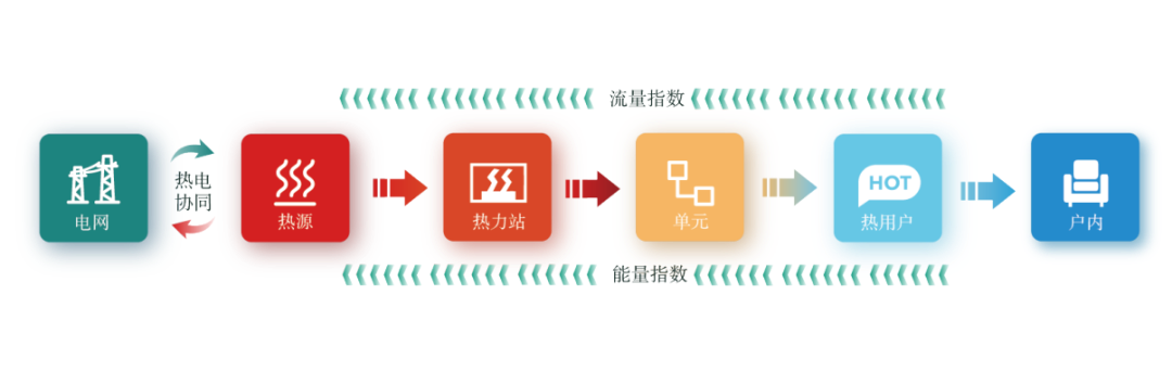 傳統(tǒng)的供熱系統(tǒng)是以“能源生產(chǎn)為導(dǎo)向”,熱源側(cè)保持供應(yīng)總量,用戶側(cè)分?jǐn)偟?ldquo;推動式”供熱。新型“源-網(wǎng)-站-戶”全域協(xié)同的供熱模式是以“負(fù)荷需求為導(dǎo)向”,根據(jù)實際需求生產(chǎn)的熱量的“拉動式”供熱。利用新一代信息化技術(shù),將水力平衡和熱力平衡的調(diào)控需求歸一為各個層級的標(biāo)準(zhǔn)流量指數(shù)和能量指數(shù),按“戶內(nèi)-熱用戶-單元-換熱站-熱源”的順序逐級依次向上傳遞,能量逐級向下精準(zhǔn)配送,進(jìn)而實現(xiàn)包括“熱電協(xié)同”在內(nèi)的“源-網(wǎng)-站-戶”全域協(xié)同。