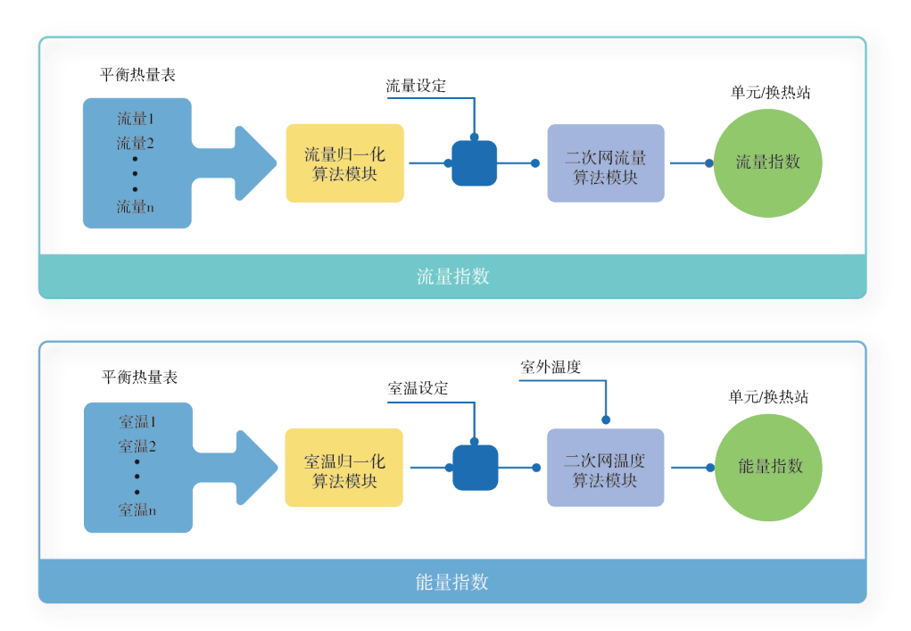 換熱站的流量指數(shù)由各熱用戶的流量加權(quán)平均而成,并進(jìn)行歸一化處理。流量指數(shù)作為二級網(wǎng)循環(huán)量閉環(huán)控制反饋信號,實現(xiàn)水力的精準(zhǔn)調(diào)控,降低循環(huán)水泵電力消耗。采用具備室溫軟測量算法的平衡熱量表作為熱用戶的智控終端,能量指數(shù)由各熱用戶的室溫軟測量數(shù)據(jù)加權(quán)平均而成,并做歸一化處理。換熱站的能量指數(shù)進(jìn)一步向熱源端反饋熱量需求,標(biāo)準(zhǔn)化的能量指數(shù)使得熱源端能根據(jù)各個換熱站的能量需求情況統(tǒng)一分配熱能給各個換熱站,實現(xiàn)熱源的精準(zhǔn)調(diào)控。采用以能量指數(shù)為核心的熱能分配體系,熱源可以充分利用供熱系統(tǒng)的熱惰性最大限度地考慮電力系統(tǒng)的負(fù)荷特性,采取主動削峰等技術(shù)手段,降低電力系統(tǒng)的容量投資。